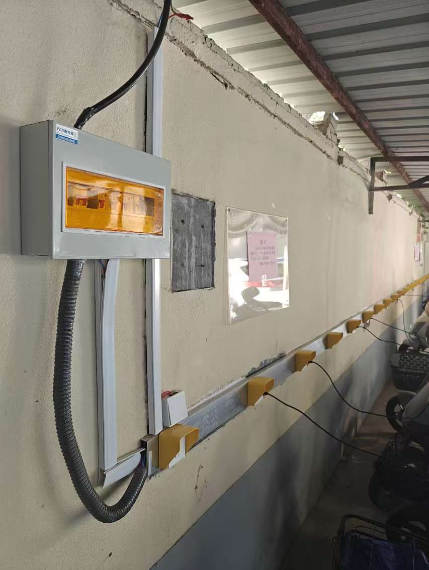 此次改造,将原有的主输出电线更换为3*10平方电缆,配置电表箱和漏电保护装置;将原有串联充电设施更改为3个独立的充电区,配置过流、过压、短路保护装置,配置4平方电线;将原有的20个普通充电插口升级为每个区设11个独立专用充电插座并配置2.5平方电线。